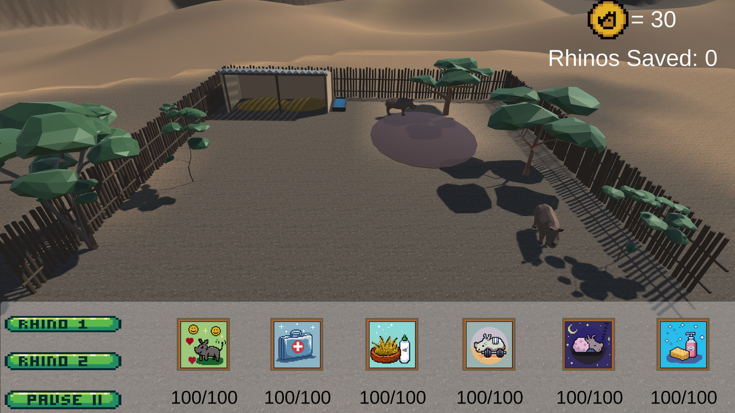 This was a project that was part of our curriculum. The brief was to create a prototype game to raise awareness and donations for an NGO. We chose The Rhino Orphanage and created a Tamagotchi style game where you care for Orphaned Rhinos until they are healthy and happy enough to be released into the wild.